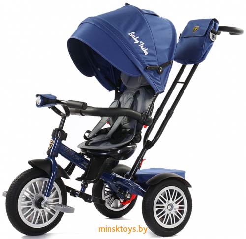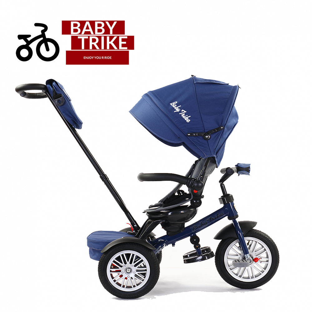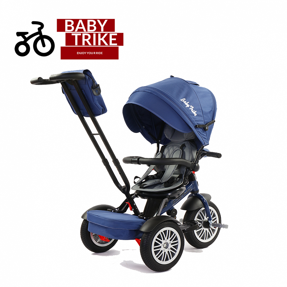 Детский велосипед Baby Trike Luxury цвет синий - революция на рынке детских трехколесных велосипедов. Надувные колеса с протектором. Диаметр переднего колеса 12 дюймов, а задних колес - 10 дюймов. Холостой ход переднего колеса. Cиденье поворотное на 180 градусов. Функциональная наклонная спинка сидения с фиксацией в двух положениях. Складная съемная крыша (на 2 сложения) со съемным козырьком. Смотровое окошко (прозрачный пвх). Съемный подголовник с мягкой накладкой. Разъёмная/съемная дуга безопасности (с мягкой накладкой из эко-кожи с фирменной строчкой). 5-точечный ремень безопасности.